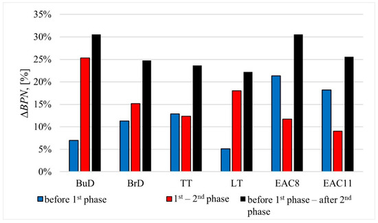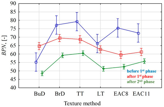 After the first phase of the process, in the cases of pavements with the texture types BuD, BrD, TT and LT, a decrease of 5–13% in the BPN values was recorded compared to the initial values. In the cases of BrD and TT slabs, the BPN values changed at a similar level (Figure 7). This was influenced by the lateral orientation of the grooves (TT) and the unevenness resulting from the lateral brushing (BrD) in relation to the direction of operation of the polishing wheels in the slab polisher.