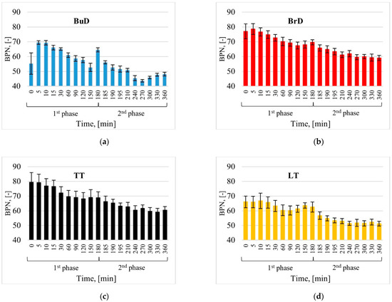 Specimens with the transverse texturing direction, BrD and TT, were characterized by high BPN values compared to other tested technologies (Figure 6b,c). This is due to the fact that the direction of the pendulum arm was perpendicular to the groove system. On the other hand, in the case of the LT surface (Figure 6d), the direction of the pendulum arm during the measurement was parallel to the groove system. The circumstances of the measurement in the laboratory were also due to the texture pattern of the actual road conditions. Consequently, the BrD and TT texturing techniques allow one to achieve higher BPN values compared to LT. The BuD surface reached low BPN values at the end of the test, comparable to the LT values.