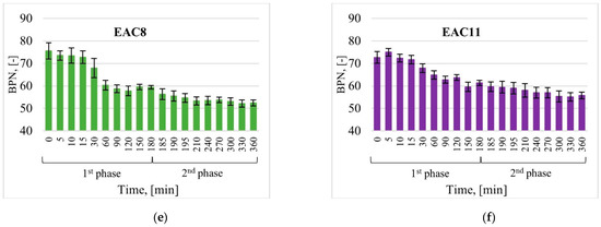 The BPN values for the EAC samples decreased by 21% and 18% after the first phase, and by 12% and 9% in the second phase (EAC8 and EAC11, respectively). In the case of the rest of the tested specimens, decreases in the BPN values ranging from 12 to 25% were recorded in phase II.