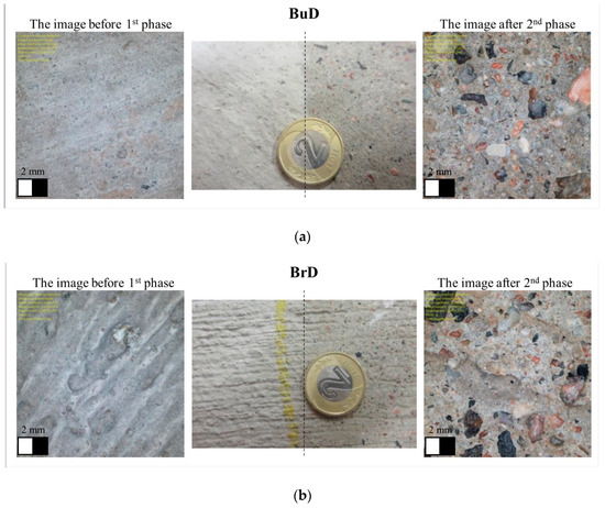 In order to recognize the mechanisms responsible for BPN changes during polishing, images of the surfaces before and after the test were analyzed under an optical-digital microscope. In the case of jute dragging-textured slabs, the polishing process removed the top layer of cement mortar. At this stage, the cement mortar with exposed fine aggregate is mainly responsible for the skid resistance (Figure 9a). In the case of tined and brushed slabs, the grooves and unevenness were damaged during polishing, which resulted in a decrease in the BPN values (Figure 9b–d). The values of the friction coefficient were mainly influenced by the unevenness resulting from the texturing method and the presence of fine aggregate exposed in the cement mortar. Fine aggregate grains were also visible on the surfaces.