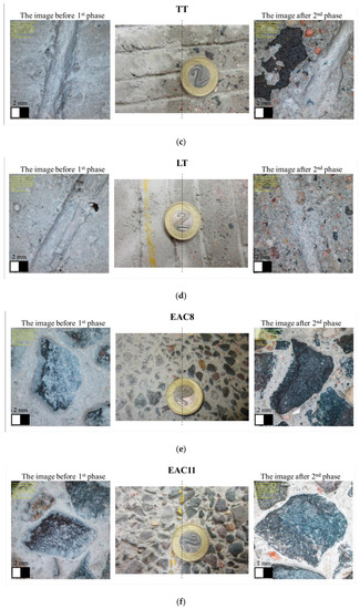 Coarse aggregate plays a more important role in EAC surfaces. Cement mortar was removed from the surfaces of the aggregate grains as a result of polishing (Figure 9e,f), and the exposed coarse aggregate grains could be treated with polishing agents. It should be noted that the contact surface on the aggregate often amounted to less than 50% of the surface of the protruding grain [59].