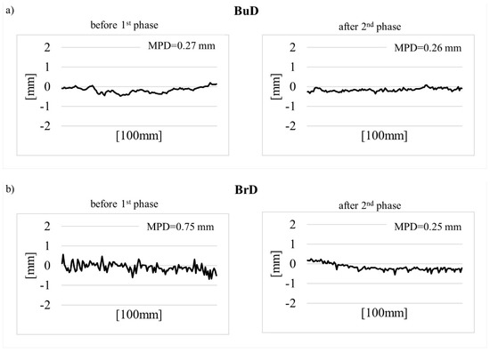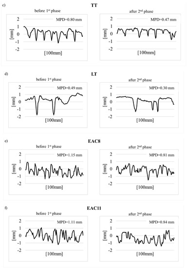Table 4 presents descriptive statistics calculated on the basis of the MPD measurement results—mean value (), standard deviation (STD), coefficient of variation (V), and minimum and maximum (MPDmin and MPDmax) values. Figure 10 shows the profiles of surface roughness, before polishing and after phase II.