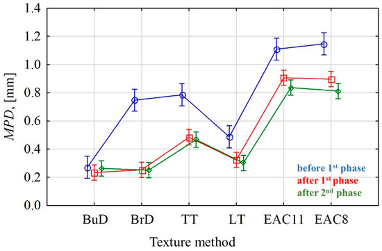 Significant differences between MPD values occurred in most of the texturing techniques at each stage of the performed test. The only exceptions are the EAC 8 and EAC 11 pavements. Even though they differed in aggregate size, their roughness profiles were very similar to each other. It was noticed that the BuD, LT and BrD surfaces also showed no significant differences in their mean profile depth values after phases I and II. This is due to the fact that their macrotexture is sensitive when there is a predominance of coarse dirt particles on the surface, which, under the influence of car traffic, rub and destroy the texture made by these methods, while the very small impurities contributing to polishing do not have a destructive effect on the profile depth.