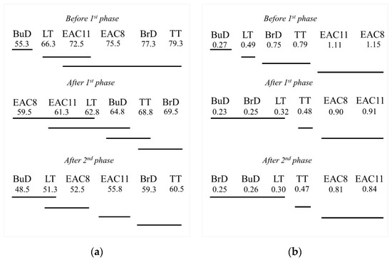 Homogeneous groups according to the HSD Tukey’s test for mean values of (a) BPN, (b) MPD.