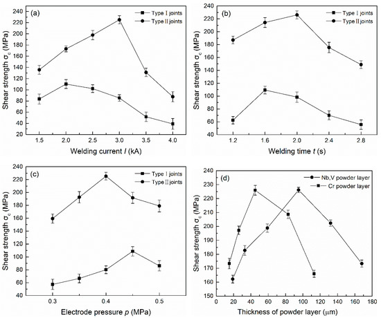 The influence of different process parameters on the shear strength of two types of joints: (a) welding current; (b) heating time; (c) electrode pressure; (d) thickness of powder layer (Type II).