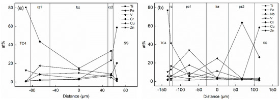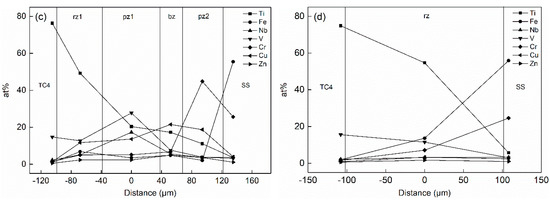 The atomic concentration distribution curves of the Type II joint with welding currents of 2, 3 and 4 kA are shown in Figure 5b–d. As the welding current increased, the amount of metal powder participating in the reaction increased, and its element content decreased. Meanwhile, the hindrance function of the metal powder gradually reduced, and the degree of diffusion of Ti and Fe elements increased. As shown in Figure 5b, the contents of Ti, Nb and V in the pz1 area were 6%, 18% and 34% when the welding current was 2 kA, respectively. The content of Cr in pz2 was 74%. The content of Fe was less than 3% in the entire joint area. As shown in Figure 5c, the content of Ti increased to 20% in the pz1 region when the welding current increased to 3 kA, and the content of Fe reached 6% in the rz1 zone. The content of Nb and V elements in pz1 decreased to 17% and 28%, and the content of Cr in pz2 reduced to 45%. As shown in Figure 5d, the powder layer disappeared when the welding current increased to 4 kA. The contents of Ti and Fe in the entire joint were 55% and 14%, and the contents of Nb, V and Cr decreased to 3%, 12% and 7%, respectively. Therefore, the blocking effect of the powder layer was remarkable when the welding current was small. Thermogenesis at the joint increased as the current increased, and more powder participated in the metallurgical reaction, which made the originally clear layer structure in the joint gradually become blurred. After the powder layer disappeared, Ti and Fe freely diffused and formed a brittle phase in the joint, which deteriorated the structure.