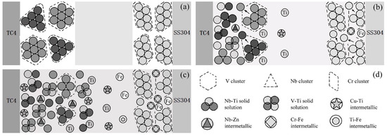 In order to characterize the influence of metal powder on the metallurgical behavior of the joint, metal powder particles were regarded as polyatomic clusters, and a metallurgical reaction model was established. Figure 6 shows the metallurgical reaction process of the metal powder particles involved in the joint. Figure 6d shows the identification of each substance. Brazing is the wetting and spreading of molten solder on the surface of a solid base material, and then metallurgical processes such as dissolution, atomic reaction and diffusion occur. When resistance brazing is performed after a powder is inserted, under the action of heat and pressure, the molten solder spreads on the surface of the base material after passing through the gap of the powder layer. Since atoms can diffuse easier in the liquid state, the base material atoms will diffuse and migrate into the brazing material between the metal powder particles, increasing the concentration of the base material atoms in the brazing material. Before the reaction, each substance showed a stable atomic structure, as shown in Figure 6a. During the reaction, resistance heat comes from internal heat sources, so the metal particles generate heat themselves, and the energy of the atomic cluster increases. The atoms at the edge first break away from the atomic clusters and then enter the liquid solder to combine with a large number of Ti atoms. Corresponding compounds were generated in the cluster gaps, as shown in Figure 6b. As the reaction progressed, the atoms on the edge of the cluster continued to enter the liquid solder, and the metal powder was continuously consumed in a peeling reaction. As shown in Figure 6c, the metal particles that were closer to the base material first reacted with the base material atoms, and their edges gradually became smooth and generated corresponding compounds. Additionally, the metal particles far away from the base material still existed in the solder, blocking the diffusion and migration of the base material atoms. On the one hand, when the metal powder intervened in the titanium alloy/stainless steel brazing joint, diffusion of the base material atoms to the opposite side was blocked. On the other hand, the morphological structure of the reactant changed due to the changing atomic reaction.