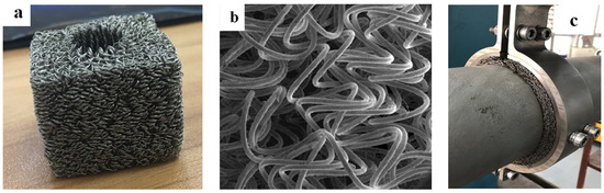 MR is a new elastic porous material which is named for its characteristics of high elasticity and large damping. It is manufactured, as shown in Figure 1a, by the cold stamping of metal wires [13]. Based on the pressing process, various structures and shapes can be prepared. Due to the raw materials of the wires, MR has the ability to adapt to various complex environments. The metal wires inside the MR are interlocked, forming a spatial network structure (Figure 1b). Under the action of external alternating load, the extrusion, sliding, and friction between the metal wires are the main ways to achieve damping and vibration reduction. Some studies have shown that the air damping effect of MR may consume a lot of energy under high-speed deformation, and it has a good development prospect in the field of impact resistance [14]. In addition to damping performance, the special molding process provides MRs with excellent stiffness performance. Figure 1c illustrates the application of laminated MR in pipeline vibration reduction. Xiao [15] designed a laminated MR coating vibration reduction structure for high-temperature pipeline vibration reduction and introduced the variation law of its energy consumption characteristics based on parameters such as amplitude, frequency, ambient temperature, and density experimentally. Ao [16] designed an MR damping pad to solve the vibration reduction problem of an engine pipeline. They conducted experiments to discuss the effect of different molding densities, component molding technologies, installed pre-compression shrinkage, and excitation force level on the damper. All metal damping materials are made of single materials. Despite the design of the layered structure, the damping performance is relatively low and cannot further meet the complex working conditions of periodic fatigue vibration. To improve the damping performance of MRs, Lu [17] designed a new damper, based on MR and SR. The dynamic characteristics were experimentally investigated, and a dynamic model was established based on the experimental results. However, in the above study, only the tangential energy consumption of the laminated damping structure was discussed, while the stiffness performance and load-bearing damping capacity of the laminated multi-base damping structure were not analyzed in depth.