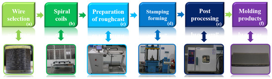 Among traditional polymer rubber materials, SR has been widely used in various engineering applications, especially in high-temperature environments, due to its excellent high-temperature resistance and stable mechanical properties in a wide temperature range [22]. Therefore, in this work, SR and MR were used as reinforcements/matrix to prepare the LCDS (Figure 4). Considering the contact layer interface and the industrial demand for vibration damping structures in narrow idle space, the specimens were shaped as thin plates. The selected parameters of SR and metal wires are shown in Table 2.