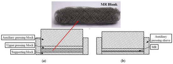 MR forming process and stress state of the metal wires contacting a rigid and a flexible surface, respectively: (a) MR forming process; (b) Contacting state.