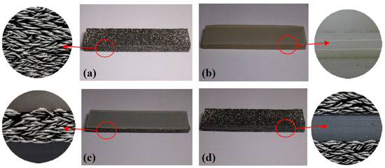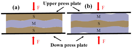 The selection of different components to serve as matrix and reinforcement in the composite structure is the key factor affecting LCDS properties, which, at the same time, introduces different physical contact interfaces in the LCDS. As shown in Figure 6, MR and SR formed four different laminated structures: (a) M-M-M, (b) S-S-S, (c) S-M-S, and (d) M-S-M. In particular, the density has a unique effect on MR stiffness and damping characteristics [23]. Therefore, MR specimens with different densities were prepared to investigate the LCDS damping energy dissipation characteristics. The specimen parameters are given in Table 1.