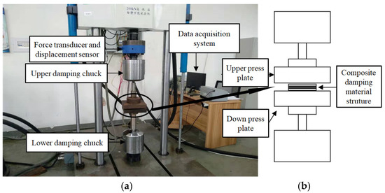 Dynamic tests on the LCDS based on MR and SR were carried out on an SDS-200 (Sinotest Equipment Co., Ltd., Changchun, China) testing machine under sinusoidal excitation to investigate the dynamic mechanical properties and damping characteristics of the prepared composite materials. The main parameters of the testing system are listed in Table 4. Figure 7 illustrates a schematic diagram of the testing system. It can be seen that the upper and lower connecting rods were, respectively, connected with the upper and lower pressing plates through threaded bolts. Before the test, the upper and lower connecting rods were connected with the upper and lower clamps of the SDS-200 dynamic and static universal testing machine, maintaining the upper and lower platens parallel. During the entire experiment, the lower platen was fixed, while the upper chuck was controlled to move up and down at a certain frequency and amplitude by the controller to produce compression deformation on the specimen. During the experiment, the sample is placed on the lower platen and moves down through the beam of the equipment, so that the upper platen preloads the sample with a certain displacement. The position at this time is the zero point. When moving downward from this zero point, the pressure is negative, and when moving upward from the equilibrium point, the pressure is positive. The sample only compressed during the whole experiment. The test element was rectangular, while the upper and lower platens were square. In the test, the centerline of the rectangular element is placed along the diagonal line of the positive pressing plate, while the four sides of the upper and lower square pressing plates were parallel, ensuring that the force on the component was radial and the effect of the axial force was eliminated.