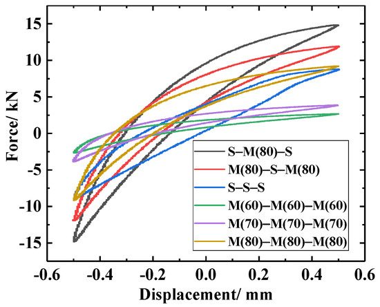 It can be seen in Figure 14 that, due to the sharp increase in the number of contact points and contact friction pairs in the MR matrix with increasing density, the overall dynamic stiffness of the LCDS increased, and the area of the hysteresis curve increased significantly, showing that the damping and energy dissipation performance was enhanced. According to Table 7, with the increase in MR matrix density, the average dynamic stiffness and energy consumption of the S-M-S laminated composite structure exhibited a significant upward trend. However, due to that the increase rate of the average dynamic stiffness was greater than that of the energy consumption , the energy dissipation factor of the S-M-S damping structure increased first and then decreased. Therefore, in laminated composite materials, the loss factor of the structure can be effectively controlled by adjusting the density of the MR matrix, ensuring that the vibration reduction characteristics of a structure in engineering applications will be preserved.