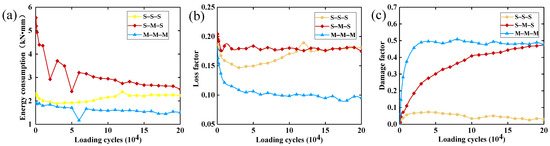 It can be seen in Figure 12a,b that the energy consumption curves of the single-material composite damping structures (S-S-S, M-M-M) exhibited a relatively stable trend with the increase in loading cycles. The energy consumption and energy dissipation factors of the S-M-S were generally better than those of the single-compound damping structures. The energy consumption and energy dissipation factors of the LCDS based on S-M-S tended to be stable with increasing number of cycles, which reflected that the structure is able to maintain a relatively stable damping performance under periodic load.
