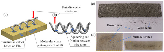 The damping effect of MR is attributed to the squeezing friction motion between the inner MR turns under interactive load (Figure 13b). Moreover, the instability and fatigue damage of the wire turns initial running in stage can often lead to performance instability characteristics under periodic cyclic load, which was specifically shown in the evolution process of the energy dissipation factor of the M-M-M structure under periodic load (Figure 12b). The damping characteristics of the SR are mainly due to the friction between molecular chains. More specifically, due to the physical entanglement between the molecular chains of the SR, the thermal motion between molecular segments is enhanced with increasing number of load cycles, while the entanglement effect is weakened. This makes the loss factor decrease first and then increase, and reach a relatively stable state after a certain number of cycles (S-S-S curve; Figure 12b). In the S-M-S composite damping structure, the performance instability caused by the MR friction damage instability effect can be significantly improved on the contact interface of the physical layer of the structure. Due to that, the stress distribution mode of the entire structure is effectively achieved through the mutual locking effect of the EIS generated between MR and SR (Figure 13a). The loss factor of the S-M-S structure tended to be stable under periodic load, without sudden changes in the damping characteristics. As shown in Figure 13c, a certain amount of debris and metal broken wire are produced under periodic load. Due to the friction of the metal wire, the surface wear is formed on the surface of SR, as shown in Figure 13d. At the same time, it can be seen that the depth of wear is not very deep.
