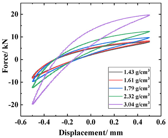 As can be observed in Figure 9, the dynamic restoring force (stiffness) of the M-M-M laminated structure under different densities was low. The dynamic stiffness and energy dissipation capacity of the LCDS increased gradually with increasing MR density. This was attributed to the reduction in the micro motion space of the wire turns in the material and the increased contact friction between wire turns, which finally exceeded the corresponding values of the S-S-S damping structure. At the same time, as can be quantitatively seen in Table 5, the loss factor presented a downward trend with increasing MR density, and was finally lower than the corresponding value of the SR. This indicated that its energy consumption characteristics were gradually improved. Compared to this, the effect of density on MR average dynamic stiffness was more significant.