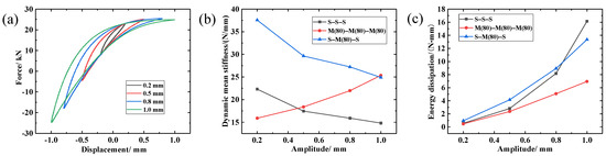 According to Table 8, the loss coefficient of the damping structure decreased first and then increased with increasing amplitude. This is attributed to the different relative change rate of the energy consumption capacity and the dynamic recovery capacity. Moreover, it can be seen in Figure 15b,c that the S-M-S composite damping structure with small amplitude exhibited higher average dynamic stiffness and energy dissipation performance than the single-compound damping structure, better meeting the load bearing requirements.