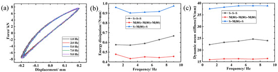 Dynamic performance of LCDS under different frequencies: (a) Hysteresis loops under different frequencies; (b) Variation of dynamic mean stiffness under different frequencies; (c) Variation of energy dissipation under different frequencies.