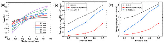 According to Table 10, the loss factor of the S-M-S structure increased first and then decreased with increasing preload. In addition, the results demonstrated that, with the increase in preload, the total energy consumption increased, and the MR damping component exhibited nonlinear stiffness characteristics, which can be divided into three types: linear elastic, soft, and hard [26]. This made the stiffness of the S-M-S structure present different growth rates with the increase in preload. Combined with Equations (3)–(5), it can be found that different relative growth rates of the average dynamic stiffness and energy consumption make the loss factor increase first and then decrease. Furthermore, it can be seen in Figure 17b,c that the stiffness and damping performance of the S-M-S damping structure were better than those of the single damping component structures (S-S-S, M-M-M) only when the density of the MR reached a certain value. Based on the S-M-S average dynamic stiffness and energy consumption change rate, it can be deduced that, when the core density is low, the stiffness range of the S-M-S structure can be wide and can be altered by simply changing the preload.