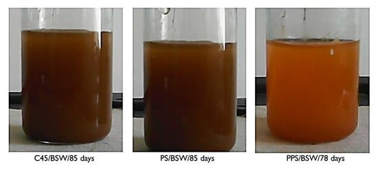 In all cases, a relatively small solution pH increased with the immersion time of the samples. This phenomenon occurs due to the reduction of H+ ions, which increases OH− ion concentration from the solution []. Compared to the C45 sample, the PS and PPS samples produce a greater change in pH in seawater, probably because in this corrosion environment, the coating layers (phosphate layer and paint) are damaged.