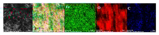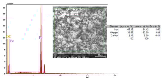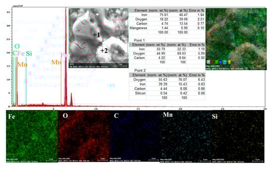 Both the energy spectrum (Figure 8) and the surface composition indicate only the presence of iron and oxygen, along with small amounts of carbon. In this composition, the molar ratio iron/Oxygen is very close to the value of 0.5 that is specific for ferric oxy-hydroxide (FeO(OH)), namely: n(Fe):n(O) = 0.57. Correlated with the type of crystals (monoclinic crystals), it can be considered that the entire surface is covered with a thick layer of FeO(OH). The presence of carbon could be attributed to the carbon dioxide absorbed in the crust. The distribution of the elements in the crust is shown in Figure 9. Areas with thick and large oxides cover parts of the surface (Figure 9), decreasing extensively the substrate iron signal. This layer plays a protective role for a while and after that, based on the continuous process of corrosion, the degradation of the material occurs. The presence of bicarbonate compounds in seawater leads to the formation of a carbon-based compound on the surface, starting from CO3 reactivity. The carbon presence was observed only on a few common parts of the oxygen distribution (Figure 9), which means that only a part of the surface compounds is complex.