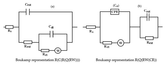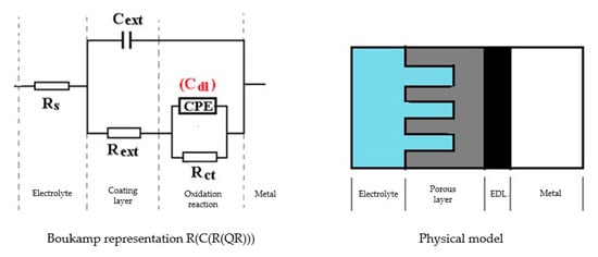 The EIS studies were performed with the PGZ 301 potentiometer (Radiometer Analytical SAS, Lyon, France), and the acquisition and processing of experimental data were performed with VoltaMaster 4 software (Version 7, Radiometer Analytical SAS, Lyon, France). The experimental data were processed with the ZSimpWin program (Version 3.5, E-chem Software, Ann Arbor, MI, USA), in which the spectra were interpreted by the fitting process developed by Boukamp, the least-squares method. To process, with this program, the data acquired with the VoltaMaster 4 program, the data were converted using the EIS file converter program. (Version 1.5, Radiometer Analytical S.A, Lyon, France) [].