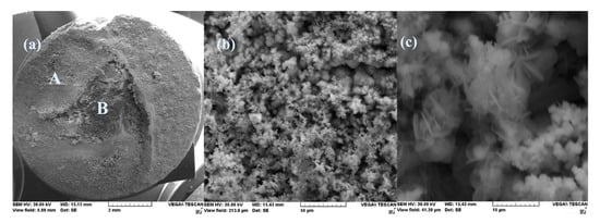 SEM microphotographs for the PPS sample maintained for 78 days in seawater (a) 100×, (b) 1000×, and (c) 5000×.