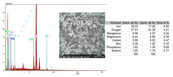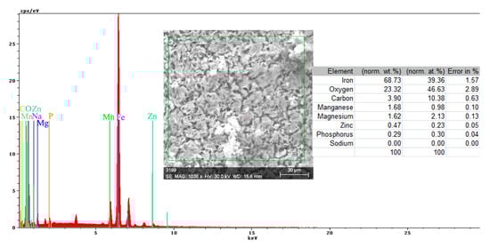 Regarding the sulfur element, the paint materials are S free, as identified on the surface based on the compounds formed between the iron-based oxides, as well from the sea solution that has 1305 mg/dm3 of SO42−. The magnesium element, as a Mg2+ (548 mg/dm3) component, is part of the BSW and passes to the surface as oxide compound or complex compound with zinc (Figure 18).