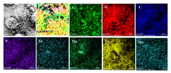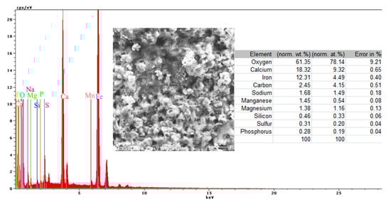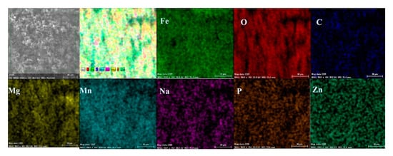 Mainly, the compounds are based on oxides, salts, and carbonates (Figure 18). There are two different corroded areas on the surface, one of them influenced by the gas release under the oxides layer. The main elements identified on the surface (Figure 18) are O, Ca, Fe, C, Na, Mn, Mg, Si, S, and P, and emerged from the substrate and immersion solution. The stability of the material surface and the beginning of the degradation process depend on the complex layer of compounds.