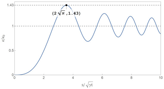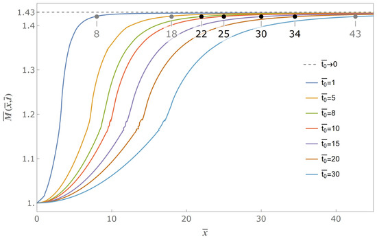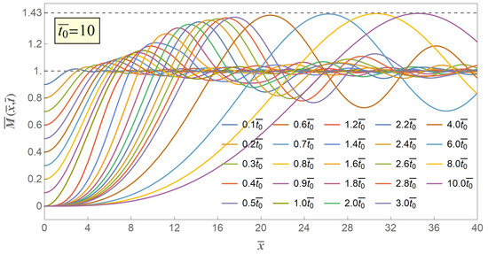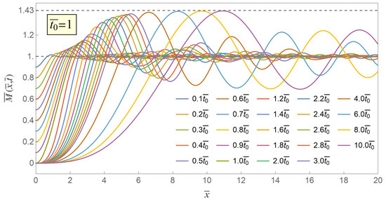 Assuming , we can get excited bending moment versus distance curves in progressive time coordinates as shown in Figure 4. The gradually declined release of initial bending moment excites a series of flexural stress waves from the free end of the stick, and these flexural stress waves locally increase the excited bending moment to beyond a critical limit and eventually lead to a secondary fracture. The excited stress wave propagates through the stick, but will not affect the physical state far away from the wave front. The excited bending moment at the free end of the stick gradually declines with the propagation time from initial value down to zero when , which is consistent with the boundary condition Equation (14), and propagates through the whole stick without any external value at the free end when . Under any time coordinate, the bending moment excited from the gradual release of the initial moment always monotonously grows to a maximum value, and this maximum value increases with time, but will not increase indefinitely. It can be seen from Figure 4, and also can be proved mathematically from the analytical solution, that the maximum excited bending moment has an asymptotic limit value of twice the maximum of the Fresnel sine integral, being 1.43. The difference between non-zero valued case and approaching zero valued case lies on the necessity of a certain propagate time when the excited moment grows to some certain value. Therefore, the introduction of gradually release boundary condition of our model brings an adjustable characteristic time parameter, and accordingly provides a possibility to predict the intrinsic fragmentation time and fragmentation length.