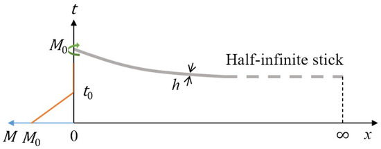 In this paper, we assume a half-infinite model in which the release of a half-infinite spaghetti stick mimics the secondary fracture process and the initial condition is that the stick is initially uniformly bent and curved, and an initial bending moment is applied at the left end and the right end is infinite. The half-infinite model is schematized in Figure 2, where the thick gray line describes a half-infinite stick with a stick thickness of h. The ordinate always represents time, while the right direction of the abscissa axis represents distance x, from to infinity, and the left direction of the abscissa axis represents bending moment M at , from its original value linearly declined to 0 within a release declining time in orange color.