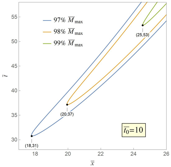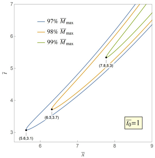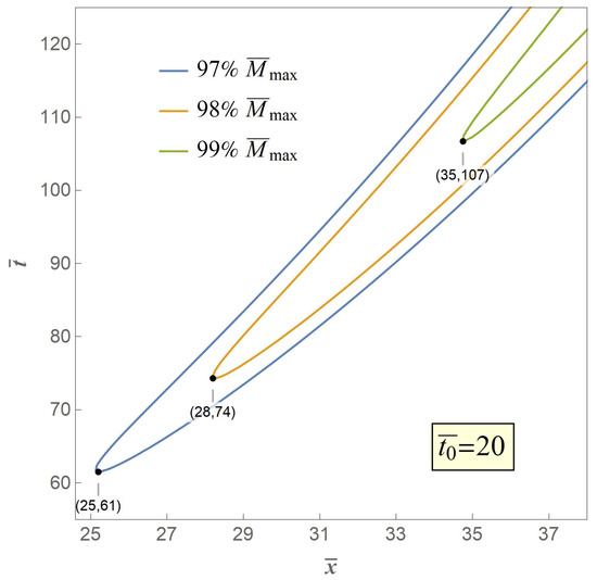 Therefore, we adopt the weakest chain principle as the crack criterion of the secondary fracture. The key to the criterion is that the secondary fracture will take place at the point of the maximum value of the excited bending moment . However, in our model is an asymptotic extremum which is actually unreachable through the whole bent process. Therefore, we propose three typical value of , the contour curves of which are illustrated in Figure 7, Figure 8 and Figure 9, respectively, when with variables of distance and time.