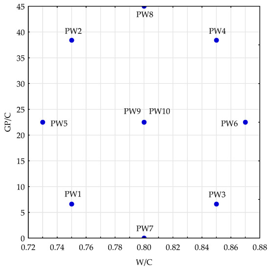 The tests were carried out on concrete mixes based on natural aggregate for five intermediate input values x1 (water to cement ratio, shortened to W/C) and x2 (glass powder to cement ratio, shortened to GP/C). The input values were W/C, in the range of 0.73–0.87 and GP/C, which was in the range of 0% to 45%. Nine series of specimens were produced, differentiated by the concrete mix composition. The studies were carried out for five intermediate values of input data x1 and x2 determined for standardised values equal to 0, ±1 and ±1.414. The standardised values resulting from the adopted plan were calculated into real values of variables. The coded variables and the compositions of the respective series of specimens in the adopted experiment plan are compiled in Table 1. As one can notice, the plan layouts (the concrete mix marked as PW9 and PW10) present the same combinations of input data values. Repeating the experiment for these combinations is necessary for the purpose of determining the error resulting from the output data measurement uncertainty. The composition of the reference mix without any glass added, in the experiment plan designated PW7, was adopted on the basis of the analysis of the specifications of C12/15 concrete used on national roads in the West Pomerania province of Poland.