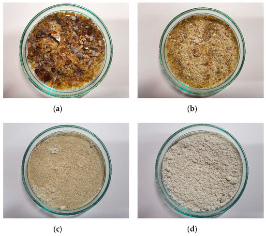 Crushing stages: (a) initially crushed; (b) crushed in crusher; (c) crushed in crusher and ground in mill; (d) crushed in crusher, ground in mill, and powdered in micro-Deval apparatus.