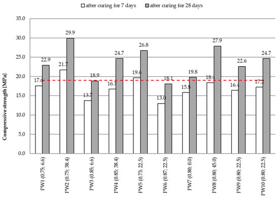 Out of each concrete mix, a series of six specimens was created for determining the compressive strength. To determine the strengths of the specimens, compression testing machines (walter + bai, Löhningen, Switzerland) were used. Compressive strength was determined after 7 and 28 days of curing the specimens in water at the temperature of 20 ± 2 °C. The tests were carried out on three 150 mm cubes, according to the procedure described in EN 12390-3 [31]. The Figure 3 represents the obtained average compressive strengths. The dashed line indicates the minimum compressive strength required to classify in C12/15 class. Additionally, values x1 (W/C) and x2 (GP/C) are given in parentheses next to the concrete mix symbol.