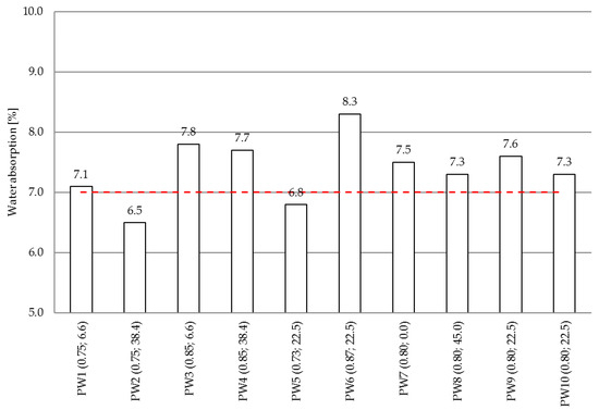 According to the obtained water absorption test results, the absorption criterion, as per PN-S-96014:1997 [26], was satisfied by only two of the tested concrete mixes, namely PW2 and PW5. These values were in the range of 6.5–8.3% (7.4% being the average value). The lowest and highest values were obtained for PW2 and PW6 mixes, respectively. As it can be seen, mixes with the same value of the water/cement ratio, viz. 0.8 mixes no. PW7–PW10, and with different proportions of waste glass have comparable absorption capacity by weight. On the other hand, different absorption capacities were obtained for mixes designated PW1 and PW2 containing 6.6% and 38.4% of waste glass powder, respectively, despite the same (yet lower than in the case of mixes PW7–PW10) W/C ratio, which in the case under analysis was 0.75.