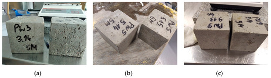 Specimens of concrete: PW3 (a), PW5 (b), and PW9 (c) after 100 freeze–thaw cycles.