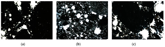 While analysing the achieved results of marking the characteristics of the air void spacing in selected concretes (PW5, PW8 and PW9), it is possible to conclude that they meet the requirements in reference to concrete utilized in XF conditions. According to the standard [32], concretes in the XF exposure classes are exposed to the aggressive impact of freezing/thawing without de-icing agents (XF1) or with de-icing agents (XF2–XF4). The air void spacing factor in concrete was between 0.07 and 0.11 mm, whereas the specific surface area of the air voids was from 18.7 to 22.1 mm−1. Differentiated results were obtained for the total air content, unlike the results of the analysis of air content in the concrete mix, defined using the pressure method (from 5.8% to 13.2%). The total air content in the hardened concrete fits within the range of 10.9–18.2%. Such a high air content is probably the result of the insufficient compacting of the specimens. The highest value of the air void spacing factor (L) and the lowest content of micro-air-voids (A300) were demonstrated by the concrete marked as PW8, which included the highest amount of the addition of glass powder. In the case of an identical water/cement ratio equal to 0.80, one can notice that in concrete PW8, along with the increase in the amount of glass powder (from 22.5% to 45.0%), there was a decrease in the total content of air and micro-air-voids (A300); whereas in concrete marked as PW5, with the water/cement ratio lower than in concrete PW9 (but with identical content of the addition of glass powder), one observes lower total content of air and of air voids with a diameter lower than 0.3 mm and a lower specific surface area of the air voids (α). Figure 7 presents the characteristic images of the microstructure of air voids in the analysed concrete specimens. As a result of colouring the surface of the polished section black and of filling all the air voids with zinc paste, the contrast image required in automatic analysis was obtained.