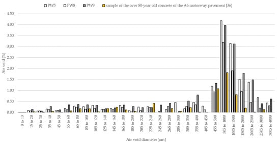 The distribution of air void diameters in the analysed concrete and sample of the over 80 year-old concrete of the A6 motorway pavement [36].
