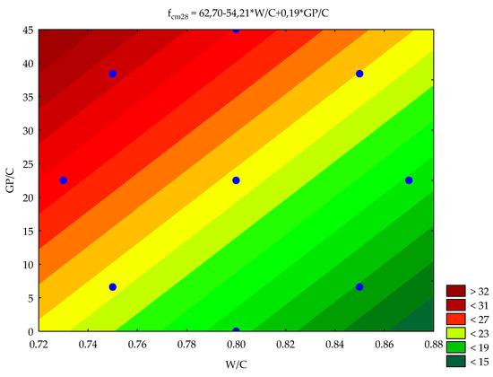 The constants Ai (regression coefficient) of this equation were obtained with the Gauss–Newton method of estimation. Using the t-Student test factors, A2, A4 and A5 were excluded as insignificant at the significance level of 0.05. The correlation factor R was 0.96. In the case of two input data values (W/C and GP/C), it is possible to develop the contour diagram that presents the response surface of the object of studies. The values of the predicted 28 day compressive strength are given in Figure 9. Blue dots have been marked on the surface of the contour diagram. These are measured values introduced into the plan.
