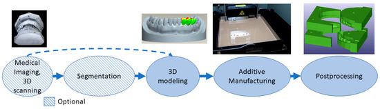 In the medical field, every patient is unique, and therefore, AM has a high potential to be utilized for personalized and customized medical applications. The most common medical clinical uses are personalized implants, medical models and saw guides [18]. In the dental field, AM is utilized on splints, orthodontic appliances, dental models and drill guides. However, AM has also been explored for making artificial tissues and organs [19]. In medicine, there is a background in digitalization of medical imaging, and that digitalization allows for reconstructing 3D models from patients’ anatomy. A typical workflow for personalized medical devices starts with imaging or capturing the patient’s geometry using computed tomography or other 3D scanning methods [20]. Then, these data are manipulated to obtain a 3D model of the patient’s anatomy, and this can be an example already of additive manufacturing such as a medical model. Moreover, the geometry can be utilized to design patient-specific implants, and this design can be additively manufactured. After manufacturing, there is quite often a need for post-processing, such as polishing [21]. When the medical device is ready, the final step is the clinical application and follow-up.