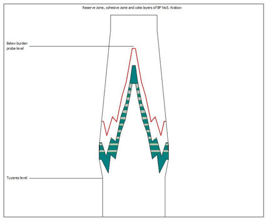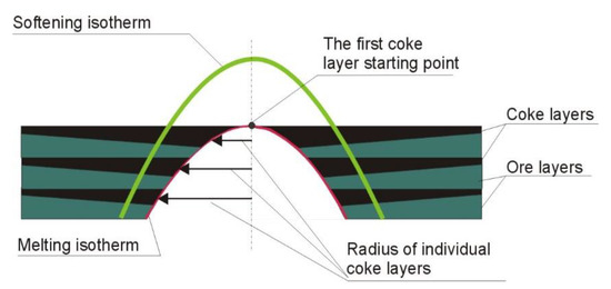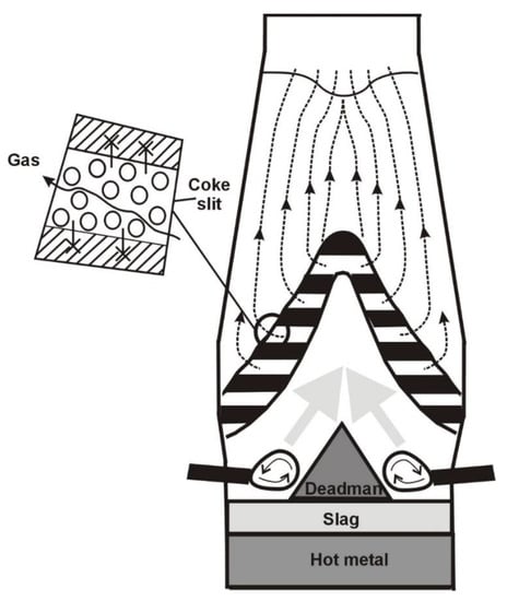 According to the definition, the cohesive zone is an area closed between the isotherms of the softening and melting of the charge oxide materials (sinter, pellets, flux, lump ore), which, being in a soft state, stick to each other and thus are impermeable to gases [5]. The only places permitting gas flow are the coke slits between cohesive ore charge layers (Figure 1). Thus, the cohesive zone plays the role of a gas distributor in the charge materials solid-state area [6].