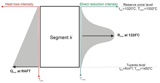 Variables in bold are unknowns. The system of Equations (1)–(4) is resolved for every eight concentric segments (k). Then, it is possible to calculate the share of charge materials masses, in kg/m3HB: