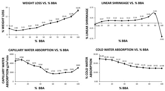 The families made of samples with the different percentages of added chamotte and BBA were tested to study their viability. Figure 3 shows the results of the loss of weight, linear shrinkage, capillary water absorption and cold water absorption of the different samples of the families after the water recirculation process. That is, after conforming and subsequent drying process in an oven, the dry weight was determined and subsequently, they were submerged in a recirculated bath and dried after 24 h.