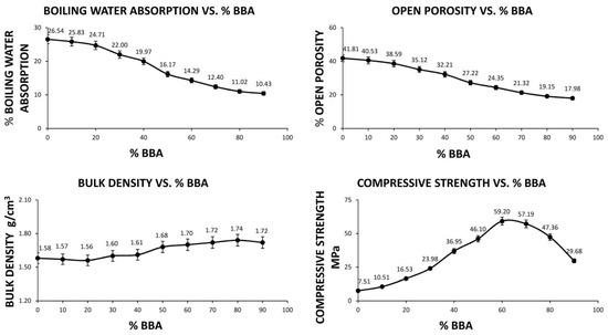 As can be seen in Figure 3, the percentage of weight loss is increasing with respect to the percentage of BBA about mixing in the geopolymer. This fact is mainly based on the ability of the geopolymerization process in the circulation of water to eliminate those superfluous elements that are not part of the geopolymer’s structure. These elements are mostly present in the BBA, since the chamotte is a stable material because of its sintering process. Compared to a traditional ceramic after sintering, which has a weight loss of around 9.5%, it can be deduced that it is quite similar, in most cases being even lower.