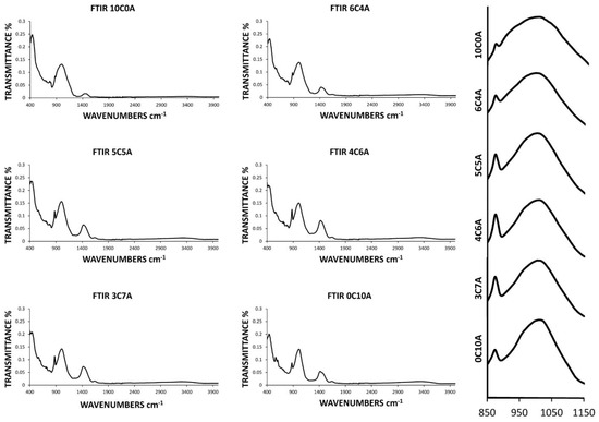 Sample families that obtained acceptable results in the freezing test were analyzed with Fourier transform infrared. For this purpose, the samples of these families were manufactured again with the process detailed in the methodology. The 10C0A and 0C10A families corresponding to 100% chamotte and 100% biomass bottom ash, respectively, were also analyzed. In this way, it was possible to evaluate the differences that existed between the different spectra of the detailed families and the base materials, thus analyzing the formation of the geopolymer and chemically corroborating its existence.