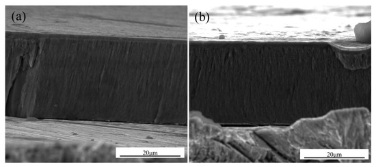 The fractured cross-sectional morphologies of the K38G and N5 nanocrystalline coatings are shown in Figure 1. The two coatings exhibited the obvious columnar structure, with a thickness of 29 μm. No obvious difference was detected between the K38G and N5 nanocrystalline coatings. The chemical composition of the two coatings were similar to that of the substrate superalloys. Combined with Table 1, the K38G nanocrystalline coating was rich in Ti, and the N5 coating was rich in Ta.
