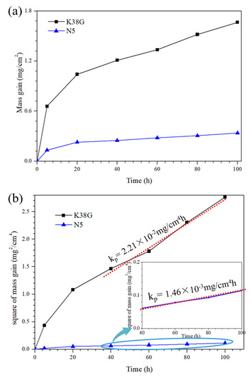 Figure 2 shows the isothermal oxidation kinetics of the K38G and N5 nanocrystalline coatings at 1050 °C. As shown in Figure 2a, both of the coatings show a rapid initial oxidation stage, followed by a slow stabilization stage. After oxidation for 100 h, the mass gain of the K38G nanocrystalline coating was 1.663 mg/cm2, while the mass gain of the N5 coating reached 0.338 mg/cm2, which was significantly lower than the K38G. All of this indicated that the components and thickness of the oxide scales on the two nanocrystalline coatings should be quite different. To explore the oxidation regulation of the two nanocrystaline coatings, the function relationship between y2 and t is plotted in Figure 2b, where y is the mass gain of the coatings and t is the oxidation time. It is clear that both nanocrystalline coatings obey the parabolic law: