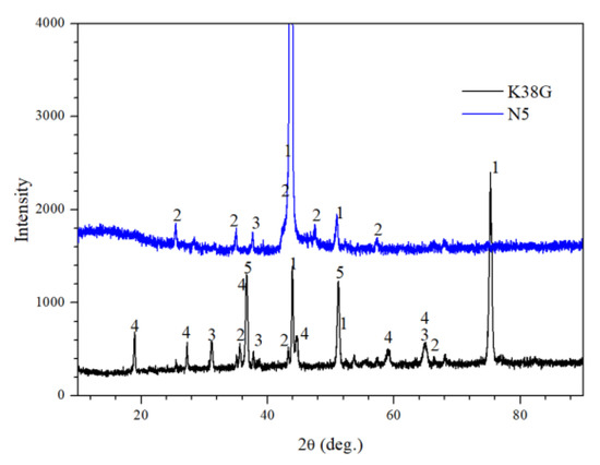 XRD patterns of the K38G and N5 nanocrystalline coatings after oxidation at 1050 °C for 100 h in air (1—γ/γ′, 2—α-Al2O3, 3—Ta2O5, 4—TiO2, 5—Ni2CrO4).