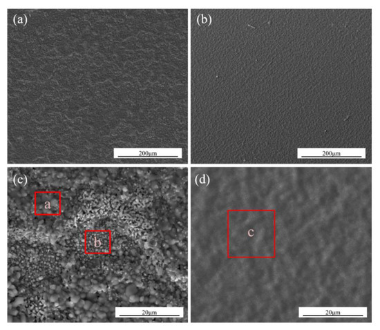 Surface morphologies of the two nanocrystalline coatings after oxidation. (a,c) K38G alloys; (b,d) N5 alloys.